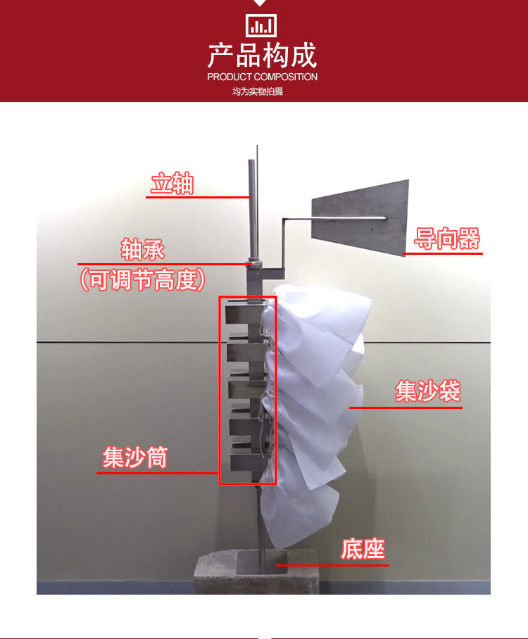 该集沙仪可在野外风沙流的现场观测中随时调整集沙筒高度;保证进沙口准确对准来风方向;进入进沙管的沙粒全部沉降在集沙布袋内,测试精度较高。