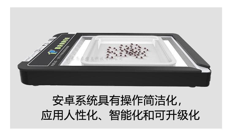 智能种子计数系统是由两部分组成:背光装置和装有嵌入式软件的平板。背光装置采用的是高亮LED灯,外边框是亚克力材料制作而成。软件采用先进的图像处理技术,根据距离变换原理、形态学、凹点切分等技术综合设计的一款嵌入式软件
