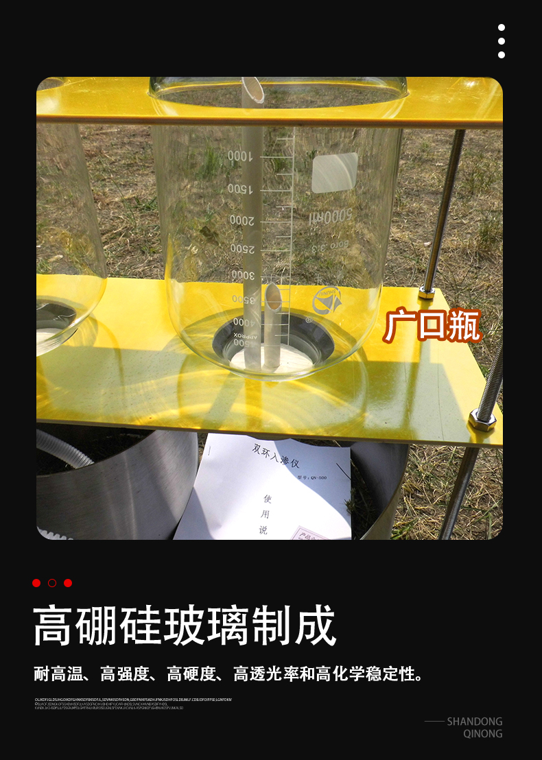 用途:试坑双环注水实验,注水管、抱箍方便拧动,四根立柱可自由调节高度,底部刃口处理 方便切入土壤,操作简单容易上手,瓶身刻度清晰方便读取数据