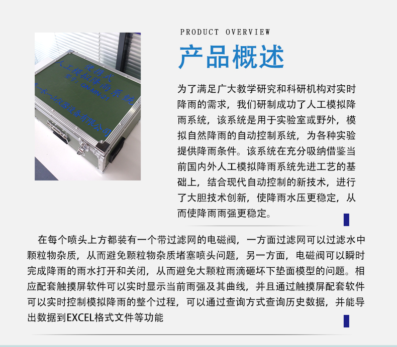 采用自动测控技术,可以在一定范围内模拟自然降雨及其不同降雨量,既精确实现了水保生态科研的专业指标要求,又满足了工业级多专业自然降雨模拟仿真的需求。