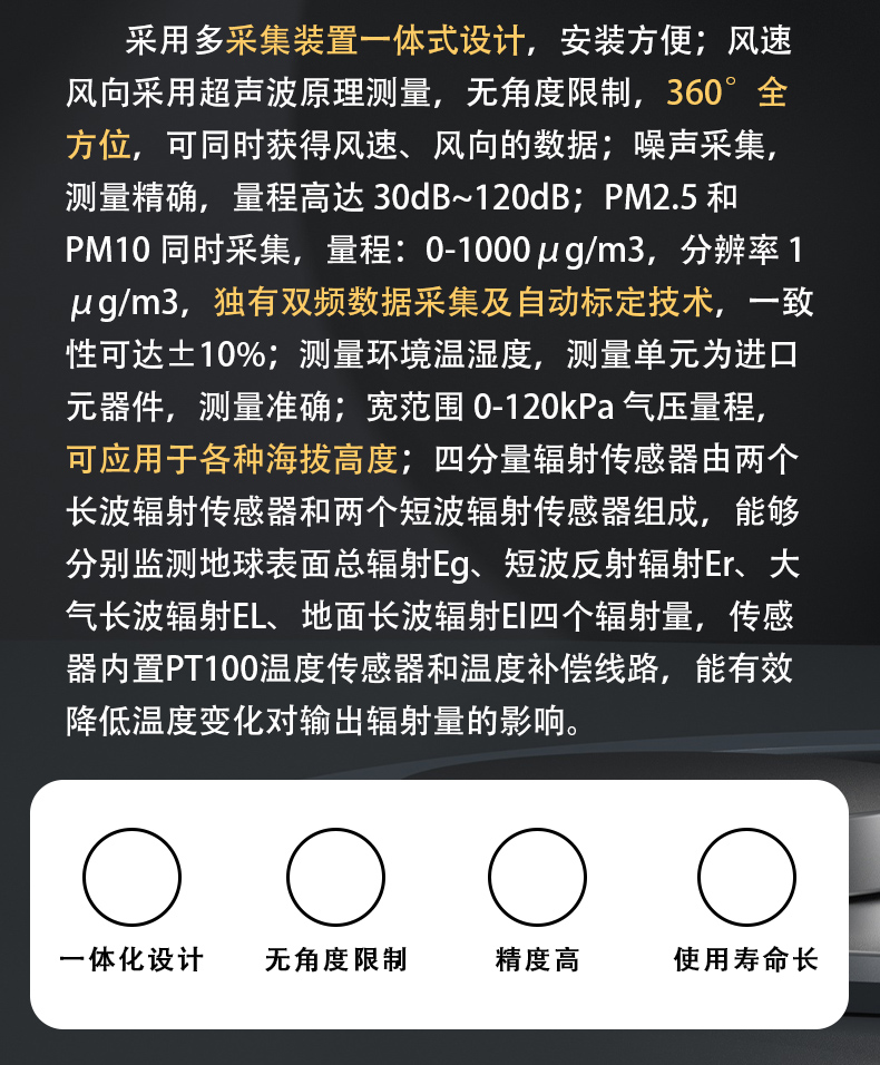 四分量净辐射传感器可广泛适用于环境检测,集风速、风向、温湿度、噪声采集、PM2.5 和 PM10、大气压力、四分量辐射于一体,设备采用标准 ModBus-RTU 通信协议,RS485 信号输出,通信距离最远可达 2000 米,可将数据通过 485 通信的方式上传至生态圈云平台。