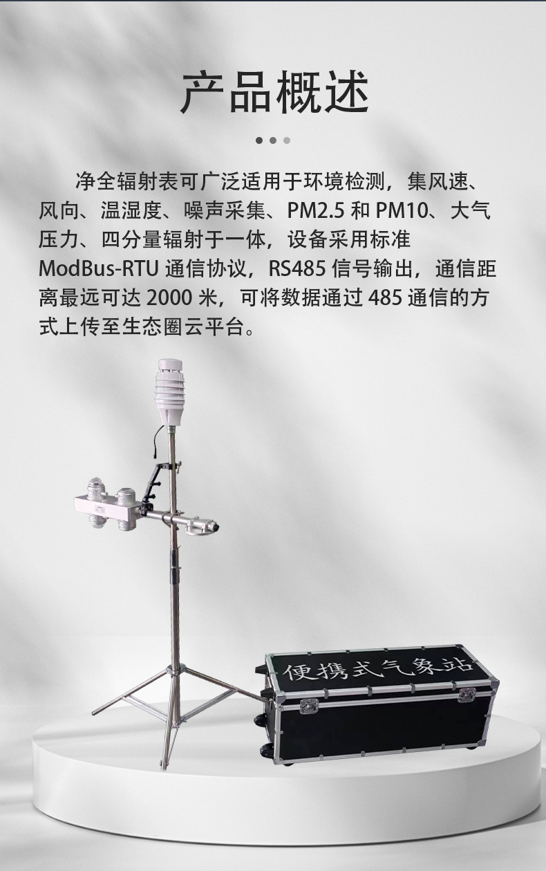 净全辐射表可广泛适用于环境检测,集风速、风向、温湿度、噪声采集、PM2.5 和 PM10、大气压力、四分量辐射于一体,设备采用标准 ModBus-RTU 通信协议,RS485 信号输出,通信距离最远可达 2000 米,可将数据通过 485 通信的方式上传至生态圈云平台。